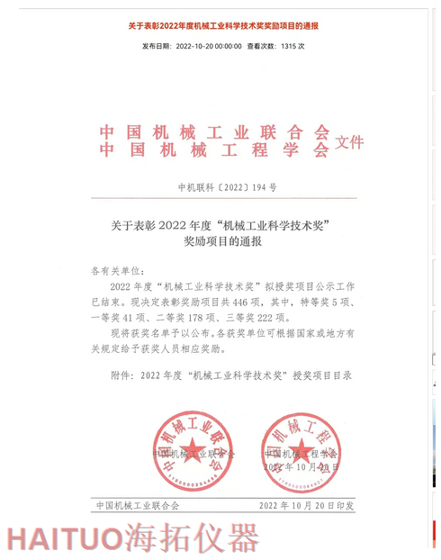 海拓儀器榮獲2022年度中國機械工業(yè)科學技術(shù)獎?ICC訊?10月20日,2022年度“中國機械工業(yè)科學技術(shù)獎”項目名錄正式發(fā)布,由海拓儀器(江蘇)有限公司完成的“超快速冷熱沖擊試驗系統(tǒng)關(guān)鍵技術(shù)研究與系列應用”項目榮獲2022年度“中國機械工業(yè)科學技術(shù)獎”三等獎。??據(jù)了解,中國機械工業(yè)科學技術(shù)獎是根據(jù)《國家科學技術(shù)獎勵條例》和《社會力量設(shè)立科學技術(shù)獎管理辦法》的有關(guān)規(guī)定,由中國機械工業(yè)聯(lián)合會和中國機械工程學會共同設(shè)立并經(jīng)國家科學技術(shù)部批準,在國家科技獎勵主管部門登記的面向全國機械行業(yè)的綜合性科技獎項。旨在表彰在機械工業(yè)科技工作中作出突出貢獻的單位和人員,獎勵范圍包括:機械工業(yè)科學技術(shù)發(fā)明成果、機械工業(yè)科學技術(shù)進步成果、機械工業(yè)工程化和新技術(shù)推廣成果和機械工業(yè)軟科學和標準成果。??海拓儀器是一家集研發(fā)、制造、貿(mào)易于一體高科技現(xiàn)代化公司,公司成立于2005年,主要產(chǎn)品包括:超快速冷熱沖擊試驗機(熱流儀)、快速溫變應力篩選試驗箱(ESS),